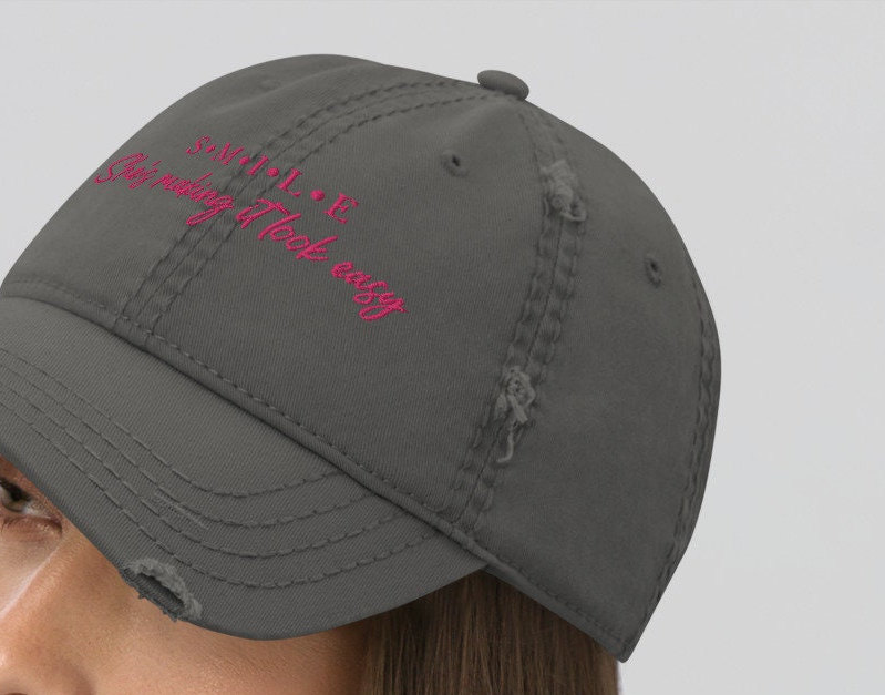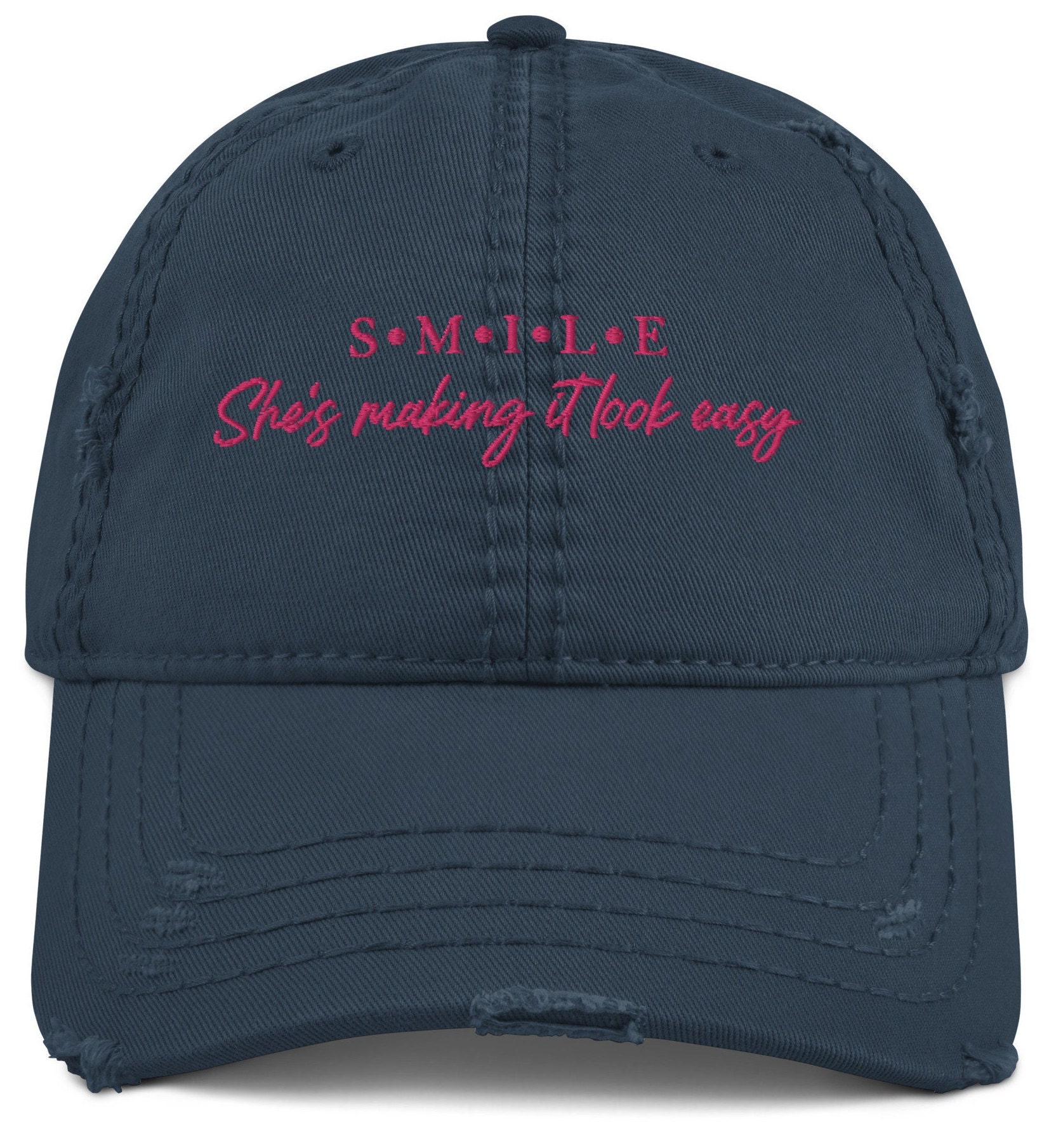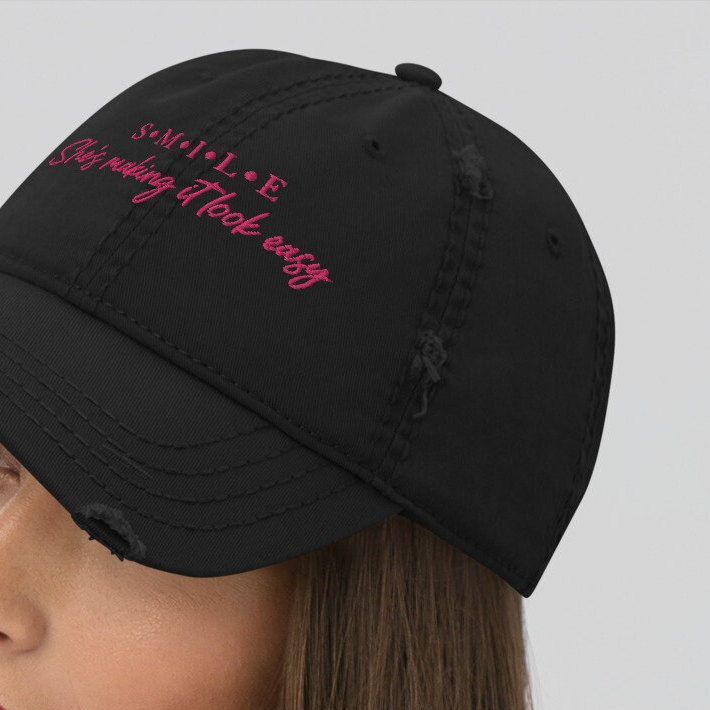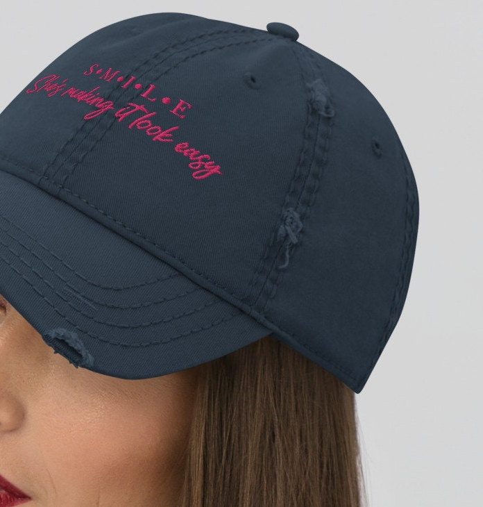 Expand your headwear collection with this fashionable dad hat. With a slightly distressed brim and crown fabric, it’ll add just the right amount of edge to your look. For a quick and easy outfit pair it with slacks, your favorite jeans, and a sports tee.