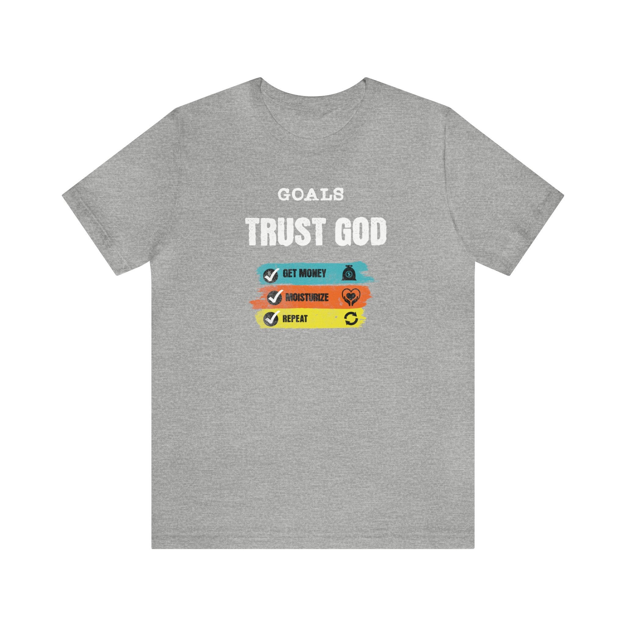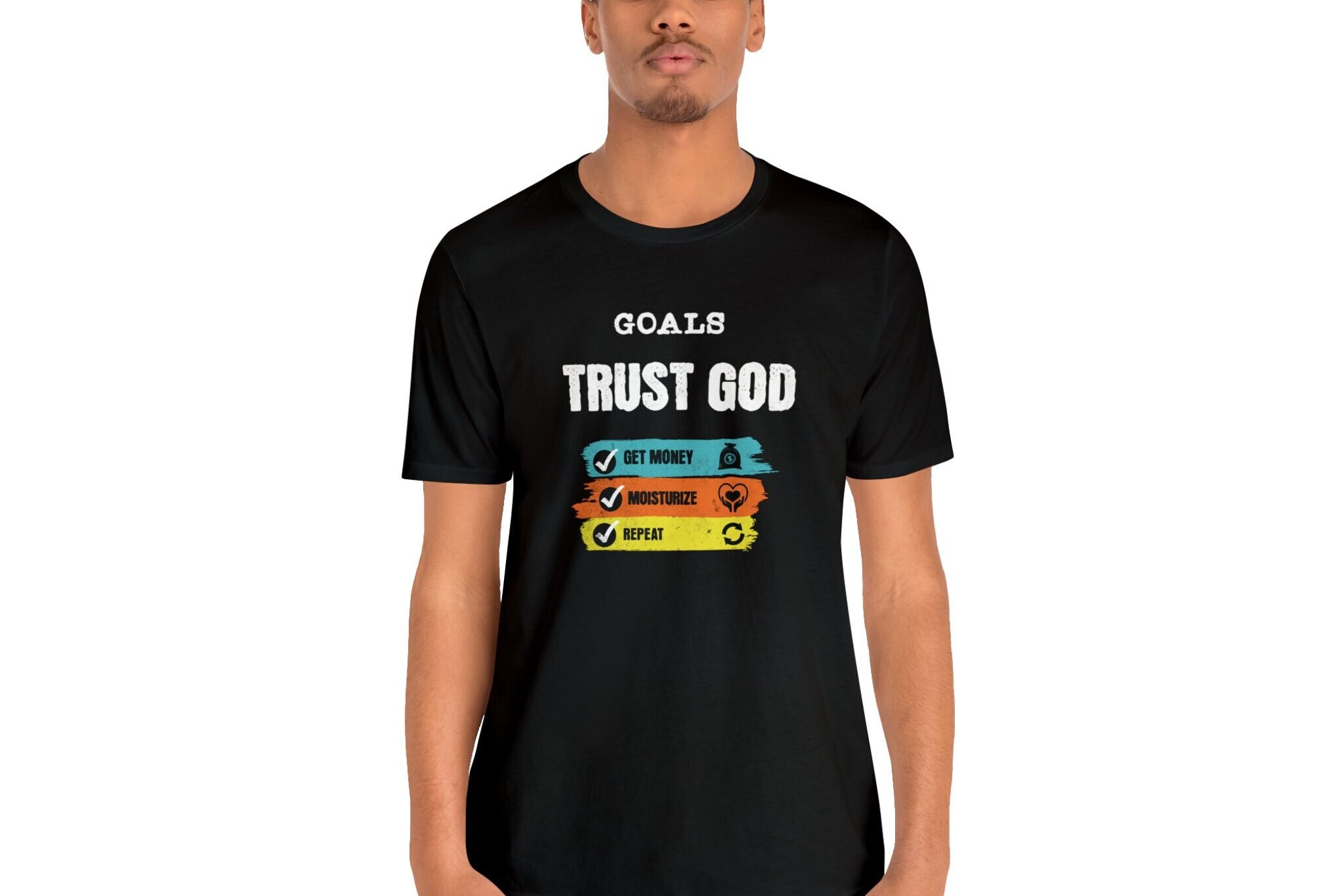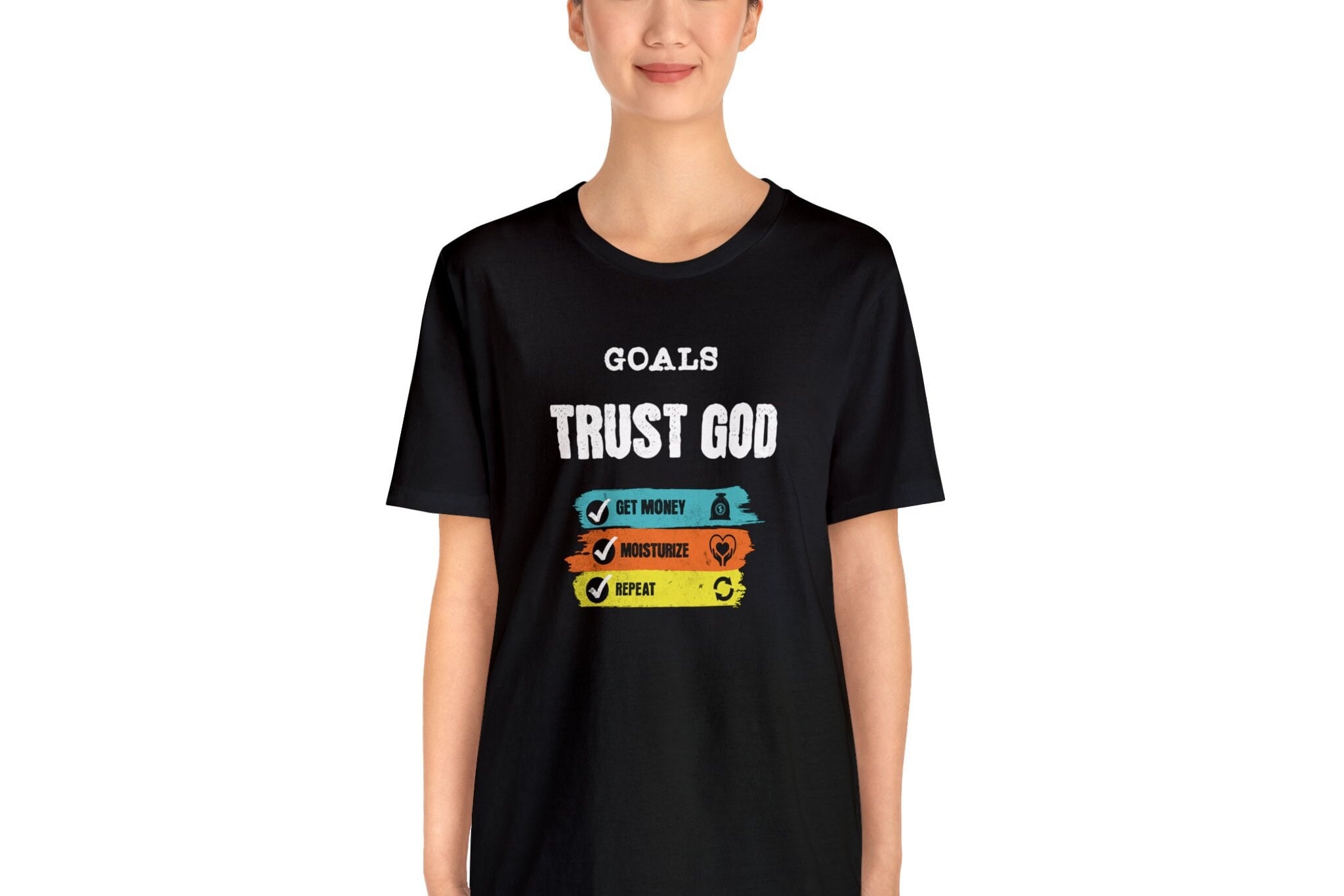 Introducing our brand new Trust God Checklist T-Shirt! This t-shirt is not only a fashion statement, but also a reminder to trust in a higher power.This classic unisex jersey short sleeve tee fits like a well-loved favorite. Soft cotton and quality print make users fall in love with it over and over again. These t-shirts have-ribbed knit collars to bolster shaping. The shoulders are tapered for a better fit over time. Dual side seams hold the garment's shape for longer. .: Made with 100% Airlume combed and ring-spun cotton, a lightweight fabric (4.2 oz/yd² (142 g/m²)) that is easy to layer, breathable. Perfect for active and leisure wear. .: The retail fit that is perfect for casual and semi-formal settings. The crew neckline adds a classic, neat style that's perfect for accessorizing. .: Bella+Canvas manufactures all its products in the US and internationally in humane, no-sweat-shop, sustainable way and is part of the Fair Labor Association as well as Platinum WRAP certified. .: The tear-away label minimizes skin irritations. .: Fabric blends: Ash and Heather Prism colors - 99% Airlume combed and ring-spun cotton, 1% polyester; Heather colors - 52% cotton, 48% polyester; Athletic Heather and Black Heather - 90% cotton, 10% polyester.