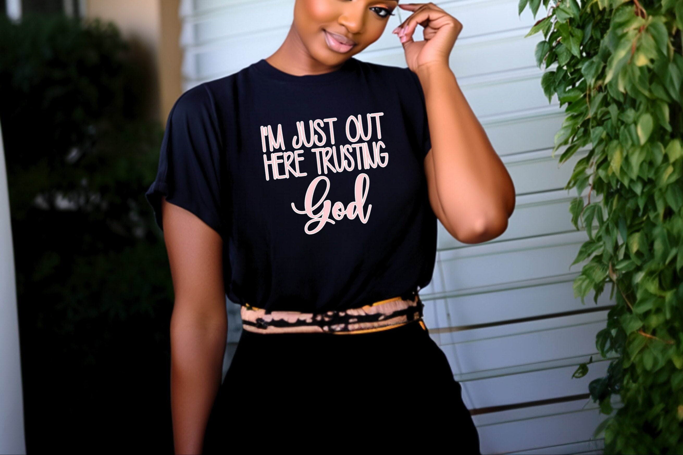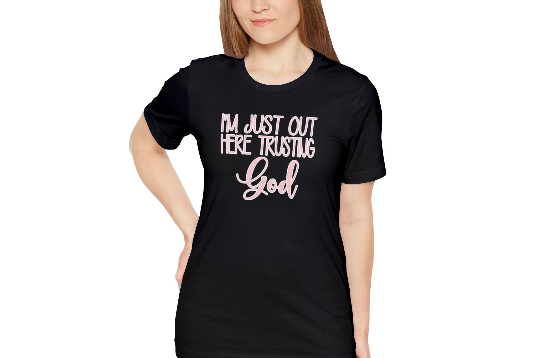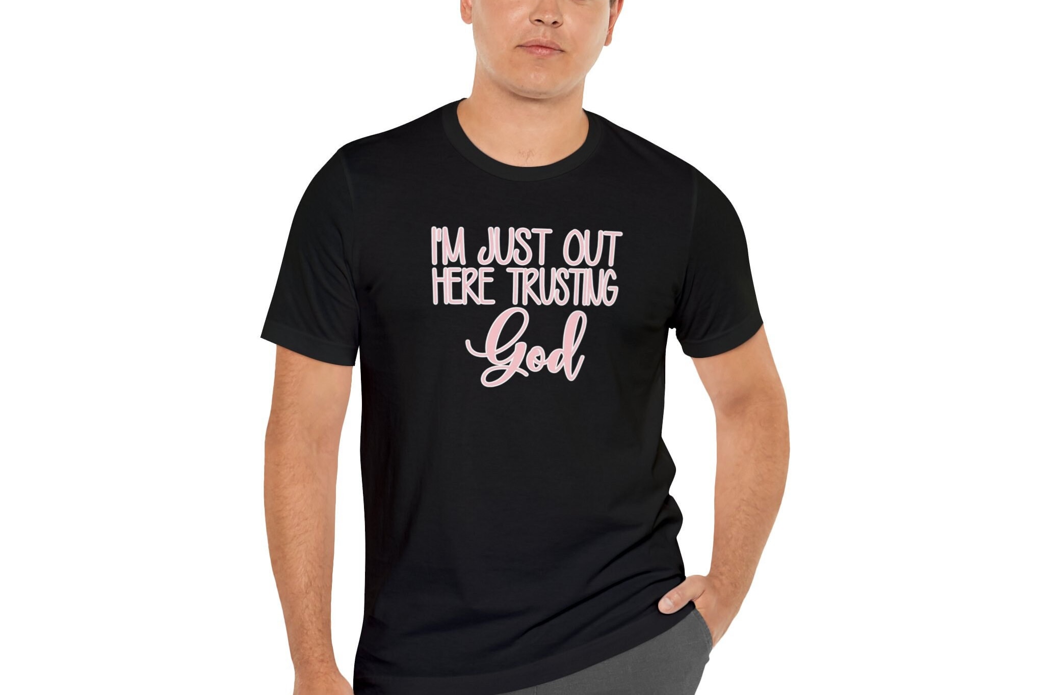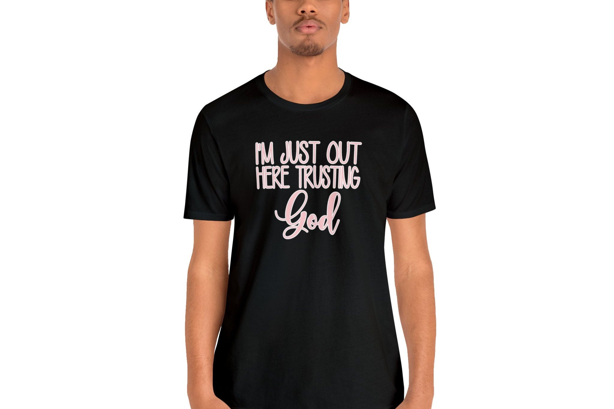 Introducing our latest arrival, the trust-inspired "I'm just out here just trusting God" t-shirt. Crafted with care, this t-shirt is designed to inspire and empower you as you navigate through life's journey. The combination of the bold and eye-catching text, "I'm just out here just trusting God," and the soft and comfortable fabric makes this t-shirt a must-have for those seeking to express their faith in style. This classic unisex jersey short sleeve tee fits like a well-loved favorite. Soft cotton and quality print make users fall in love with it over and over again. These t-shirts have-ribbed knit collars to bolster shaping. The shoulders are tapered for a better fit over time. Dual side seams hold the garment's shape for longer. .: Made with 100% Airlume combed and ring-spun cotton, a lightweight fabric (4.2 oz/yd² (142 g/m²)) that is easy to layer, breathable. Perfect for active and leisure wear. .: The retail fit that is perfect for casual and semi-formal settings. The crew neckline adds a classic, neat style that's perfect for accessorizing. .: Bella+Canvas manufactures all its products in the US and internationally in humane, no-sweat-shop, sustainable way and is part of the Fair Labor Association as well as Platinum WRAP certified. .: The tear-away label minimizes skin irritations. .: Fabric blends: Ash and Heather Prism colors - 99% Airlume combed and ring-spun cotton, 1% polyester; Heather colors - 52% cotton, 48% polyester; Athletic Heather and Black Heather - 90% cotton, 10% polyester.