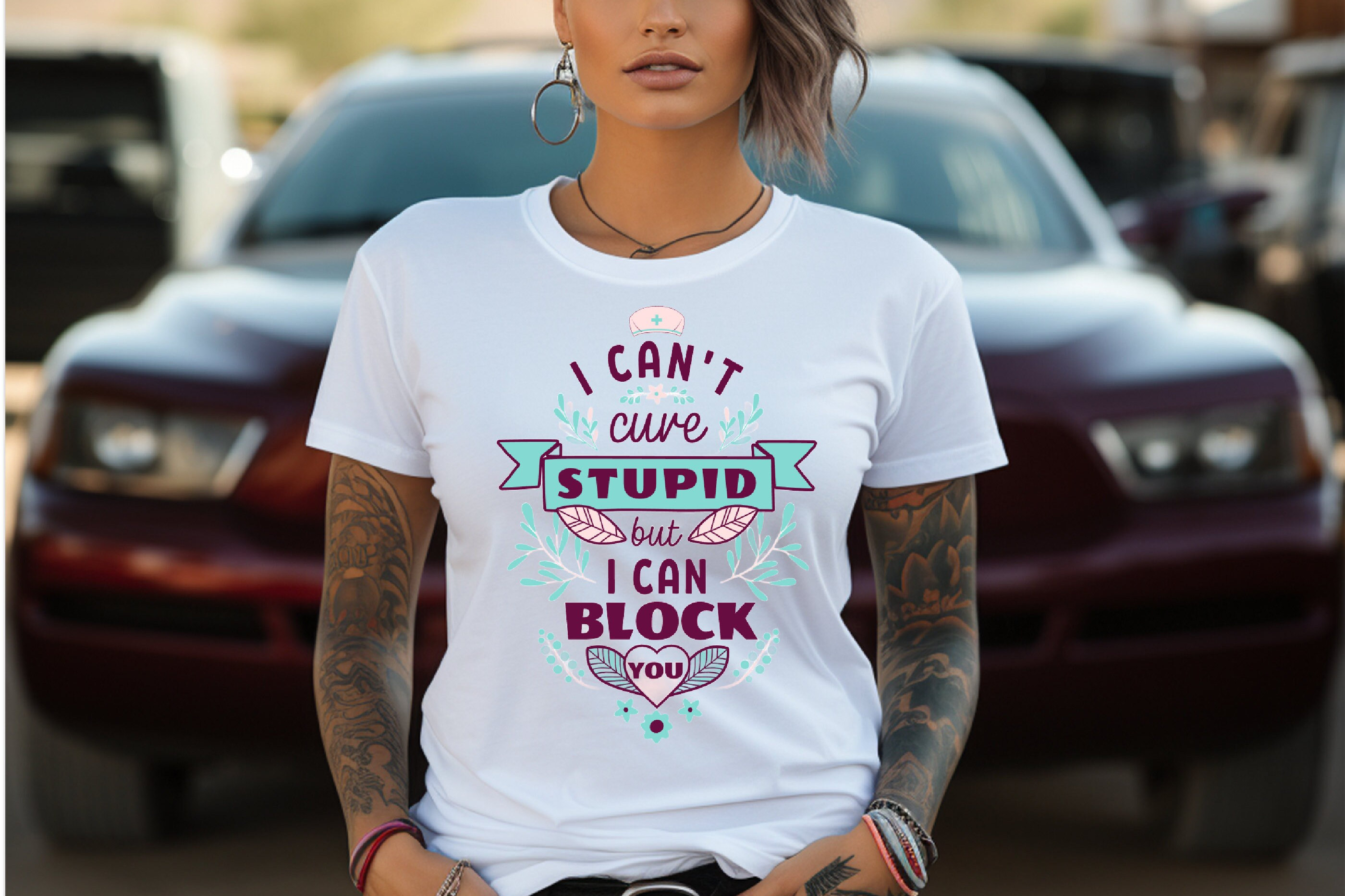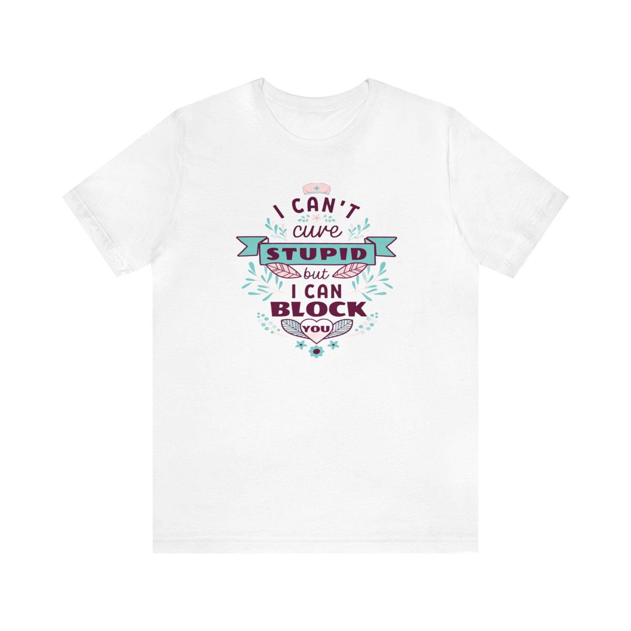 Introducing our eye-catching t-shirt that combines witty humor with a touch of attitude. Express yourself with the bold statement, "I can't cure stupid, but I can BLOCK YOU", printed in vibrant, attention-grabbing letters, this classic unisex jersey short sleeve tee fits like a well-loved favorite. Soft cotton and quality print make users fall in love with it over and over again. These t-shirts have-ribbed knit collars to bolster shaping. The shoulders are tapered for a better fit over time. Dual side seams hold the garment's shape for longer. .: Made with 100% Airlume combed and ring-spun cotton, a lightweight fabric (4.2 oz/yd² (142 g/m²)) that is easy to layer, breathable. Perfect for active and leisure wear. .: The retail fit that is perfect for casual and semi-formal settings. The crew neckline adds a classic, neat style that's perfect for accessorizing. .: Bella+Canvas manufactures all its products in the US and internationally in humane, no-sweat-shop, sustainable way and is part of the Fair Labor Association as well as Platinum WRAP certified. .: The tear-away label minimizes skin irritations. .: Fabric blends: Ash and Heather Prism colors - 99% Airlume combed and ring-spun cotton, 1% polyester; Heather colors - 52% cotton, 48% polyester; Athletic Heather and Black Heather - 90% cotton, 10% polyester.