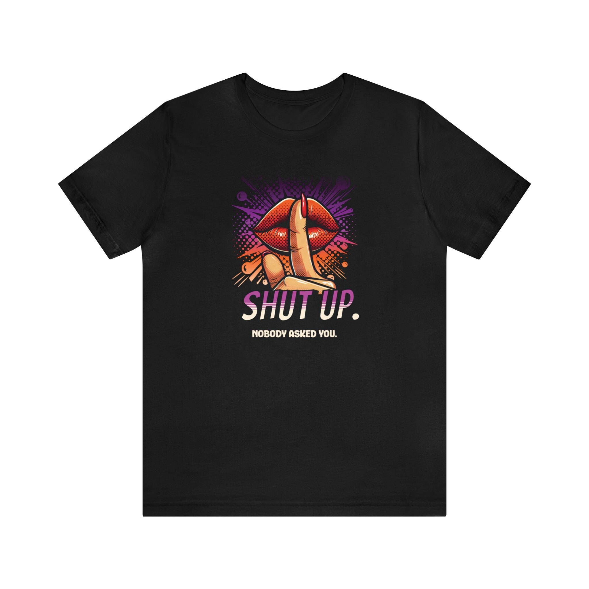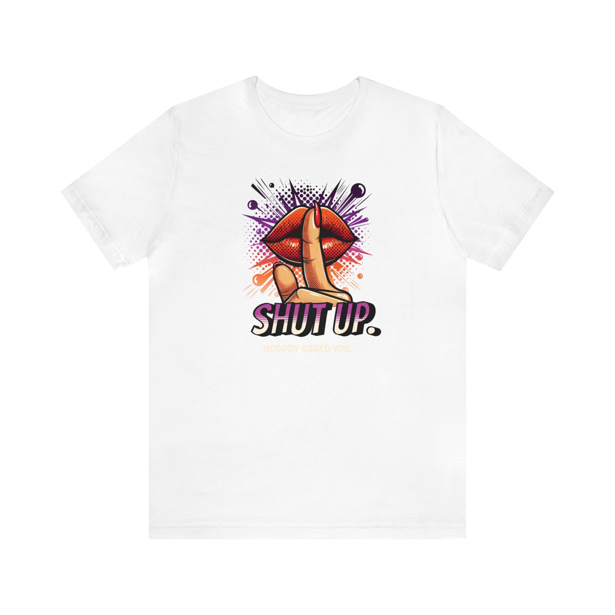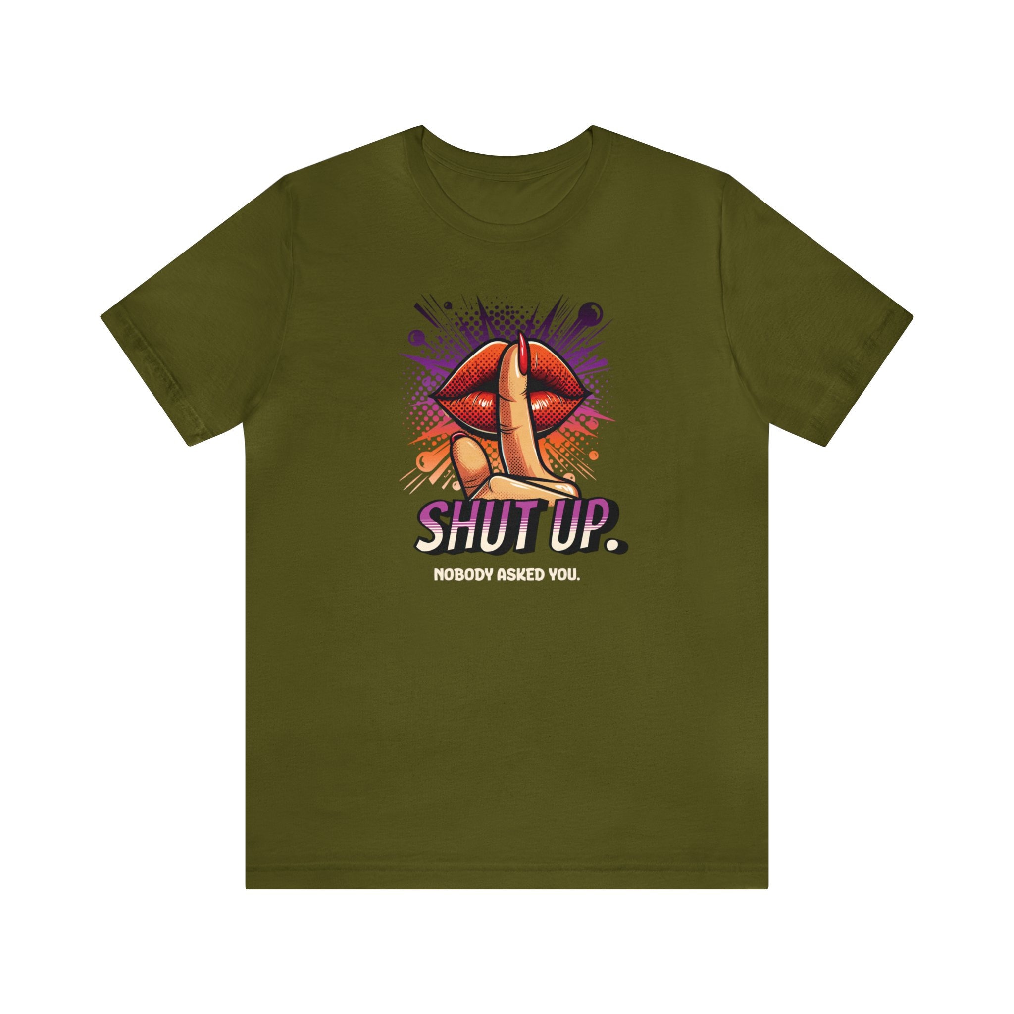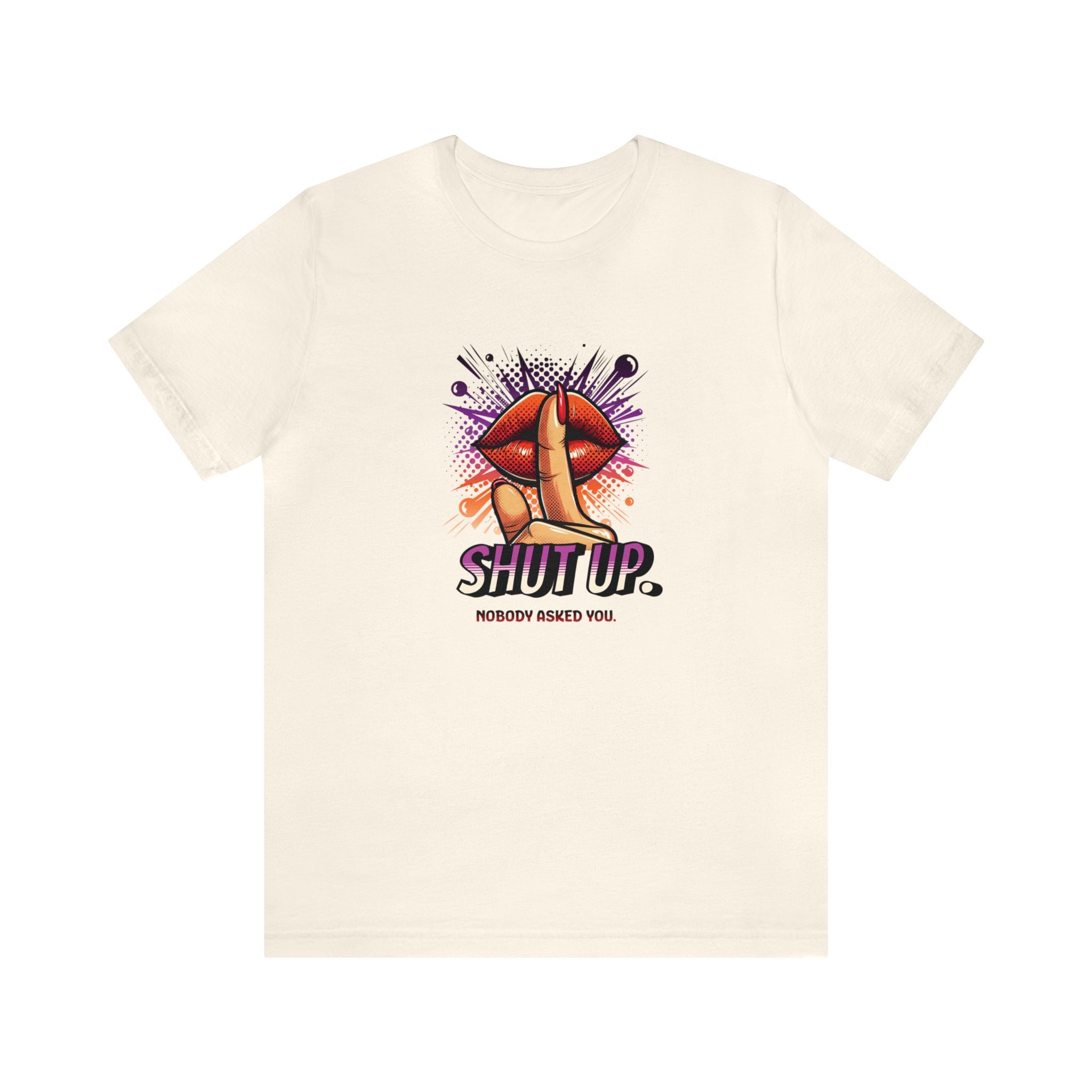 Our Shut Up Graphic Tee is bound to make a statement wherever you go. This funny t-shirt features a bold print that adds an element of humor and sarcasm to your outfit. Crafted as a unisex tee.This classic unisex jersey short sleeve tee fits like a well-loved favorite. Soft cotton and quality print make users fall in love with it over and over again. These t-shirts have-ribbed knit collars to bolster shaping. The shoulders are tapered for a better fit over time. Dual side seams hold the garment's shape for longer. .: Made with 100% Airlume combed and ring-spun cotton, a lightweight fabric (4.2 oz/yd² (142 g/m²)) that is easy to layer, breathable. Perfect for active and leisure wear. .: The retail fit that is perfect for casual and semi-formal settings. The crew neckline adds a classic, neat style that's perfect for accessorizing. .: Bella+Canvas manufactures all its products in the US and internationally in humane, no-sweat-shop, sustainable way and is part of the Fair Labor Association as well as Platinum WRAP certified. .: The tear-away label minimizes skin irritations. .: Fabric blends: Ash and Heather Prism colors - 99% Airlume combed and ring-spun cotton, 1% polyester; Heather colors - 52% cotton, 48% polyester; Athletic Heather and Black Heather - 90% cotton, 10% polyester.