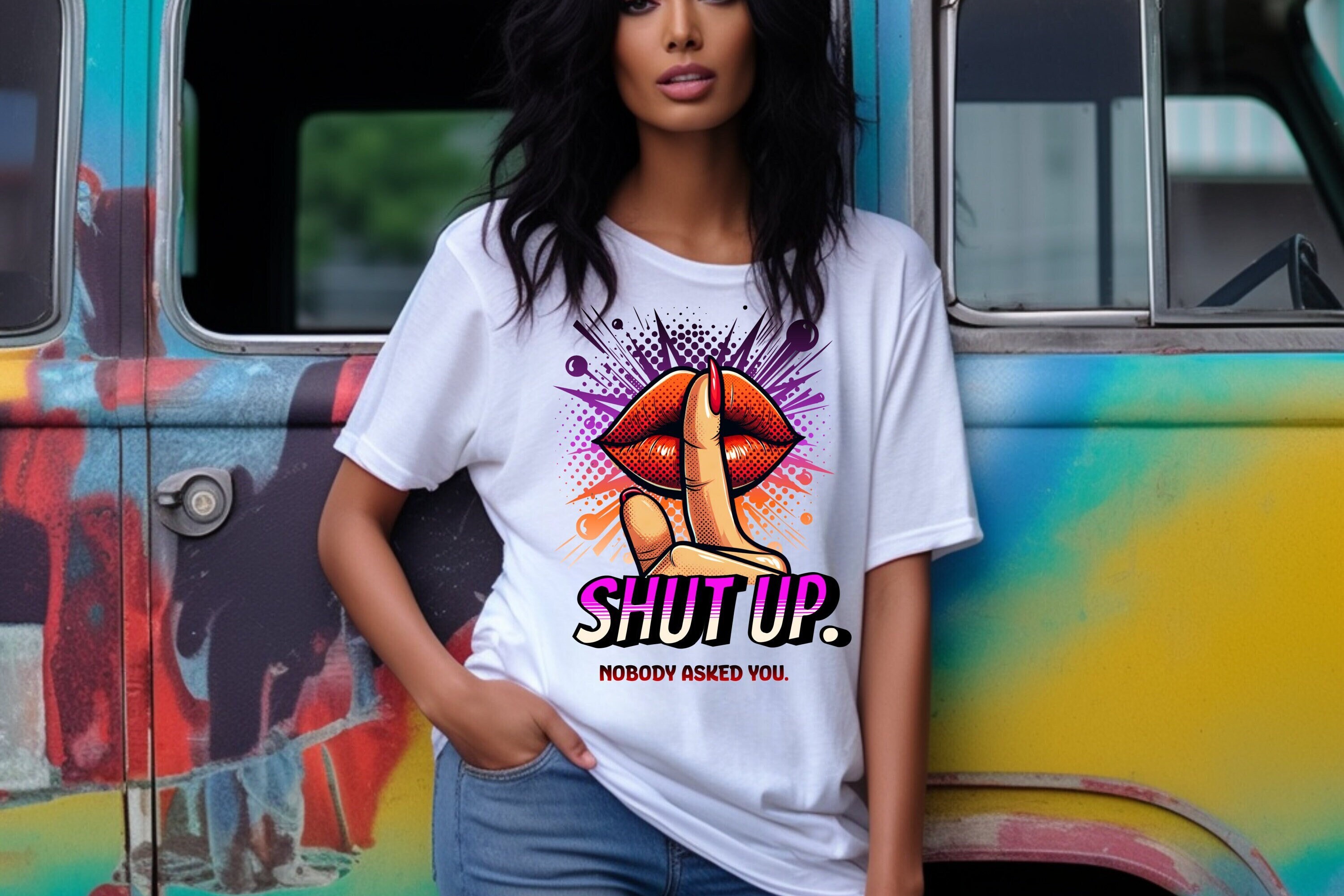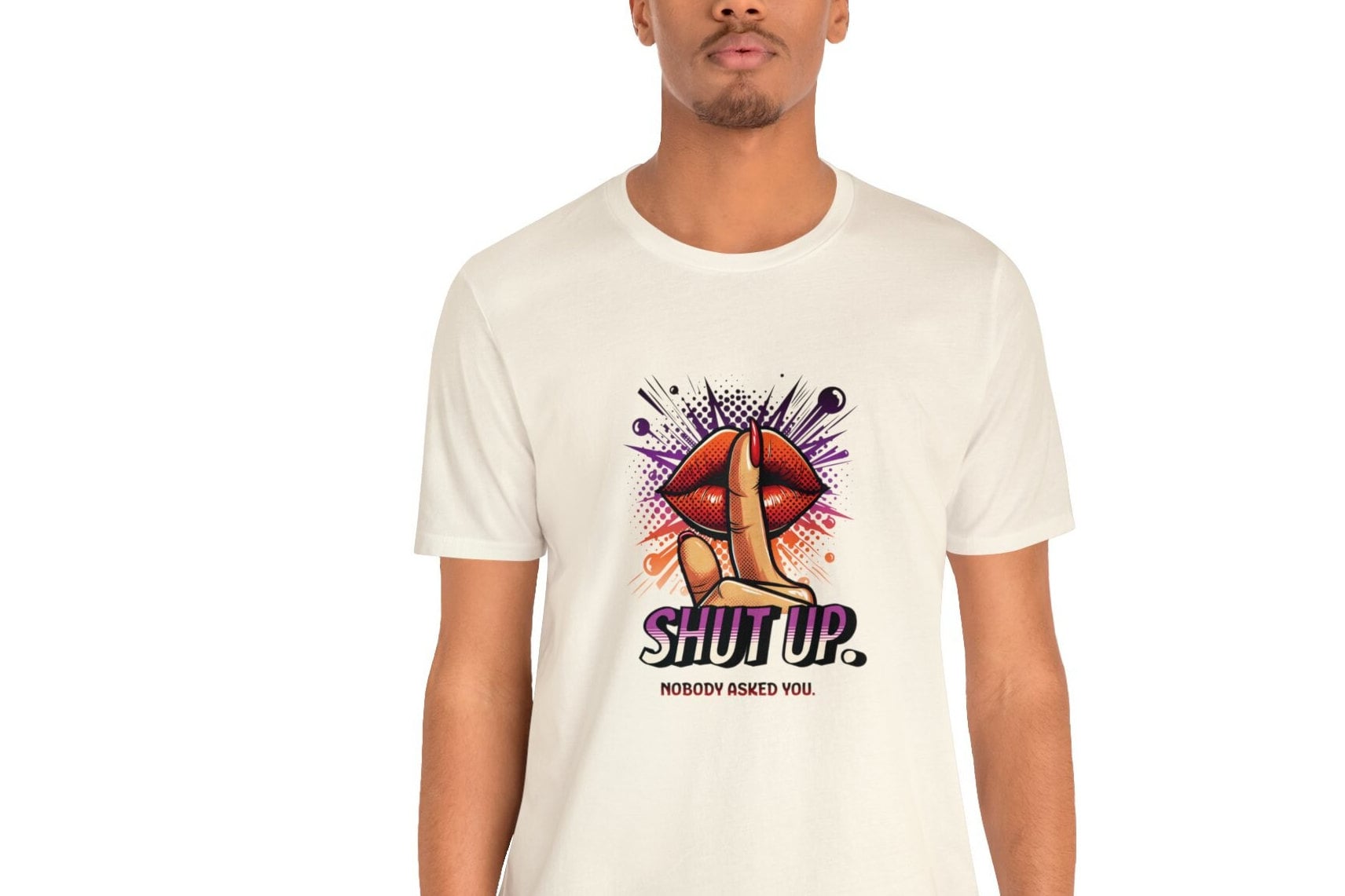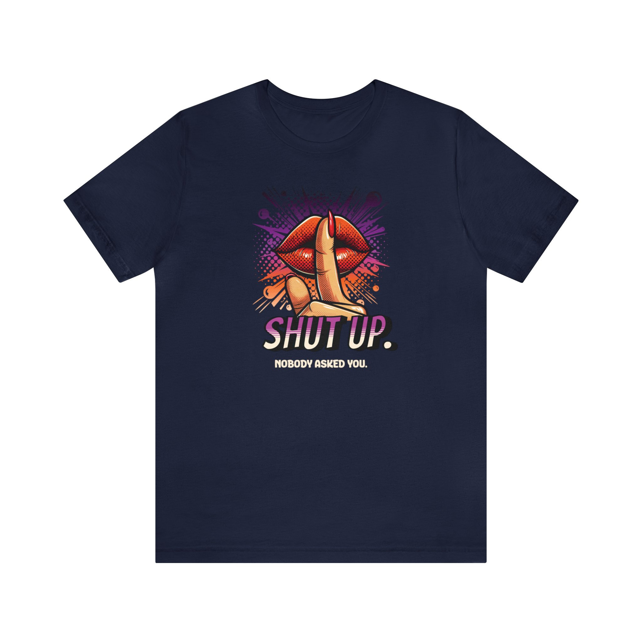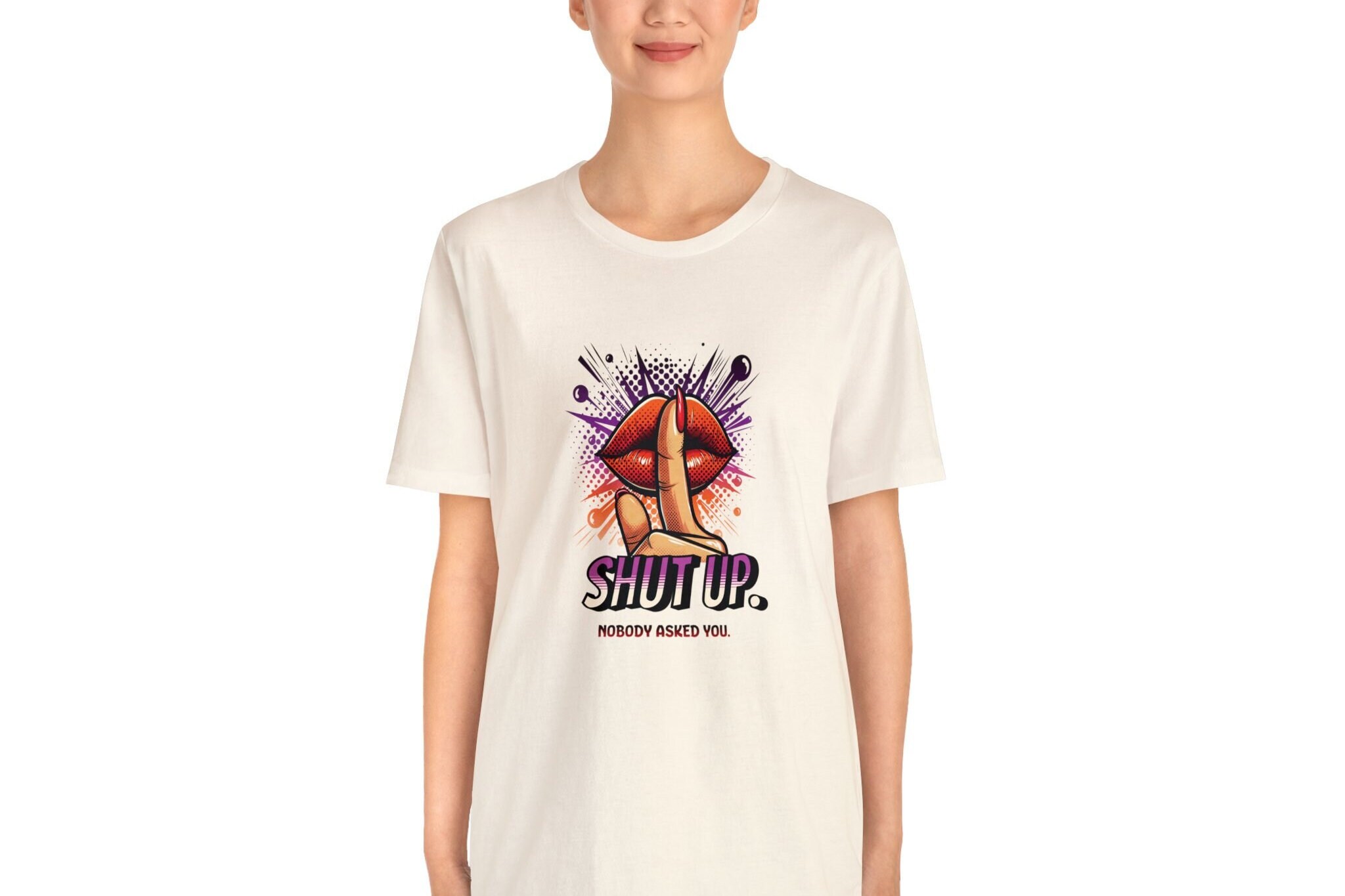 Our Shut Up Graphic Tee is bound to make a statement wherever you go. This funny t-shirt features a bold print that adds an element of humor and sarcasm to your outfit. Crafted as a unisex tee.This classic unisex jersey short sleeve tee fits like a well-loved favorite. Soft cotton and quality print make users fall in love with it over and over again. These t-shirts have-ribbed knit collars to bolster shaping. The shoulders are tapered for a better fit over time. Dual side seams hold the garment's shape for longer. .: Made with 100% Airlume combed and ring-spun cotton, a lightweight fabric (4.2 oz/yd² (142 g/m²)) that is easy to layer, breathable. Perfect for active and leisure wear. .: The retail fit that is perfect for casual and semi-formal settings. The crew neckline adds a classic, neat style that's perfect for accessorizing. .: Bella+Canvas manufactures all its products in the US and internationally in humane, no-sweat-shop, sustainable way and is part of the Fair Labor Association as well as Platinum WRAP certified. .: The tear-away label minimizes skin irritations. .: Fabric blends: Ash and Heather Prism colors - 99% Airlume combed and ring-spun cotton, 1% polyester; Heather colors - 52% cotton, 48% polyester; Athletic Heather and Black Heather - 90% cotton, 10% polyester.