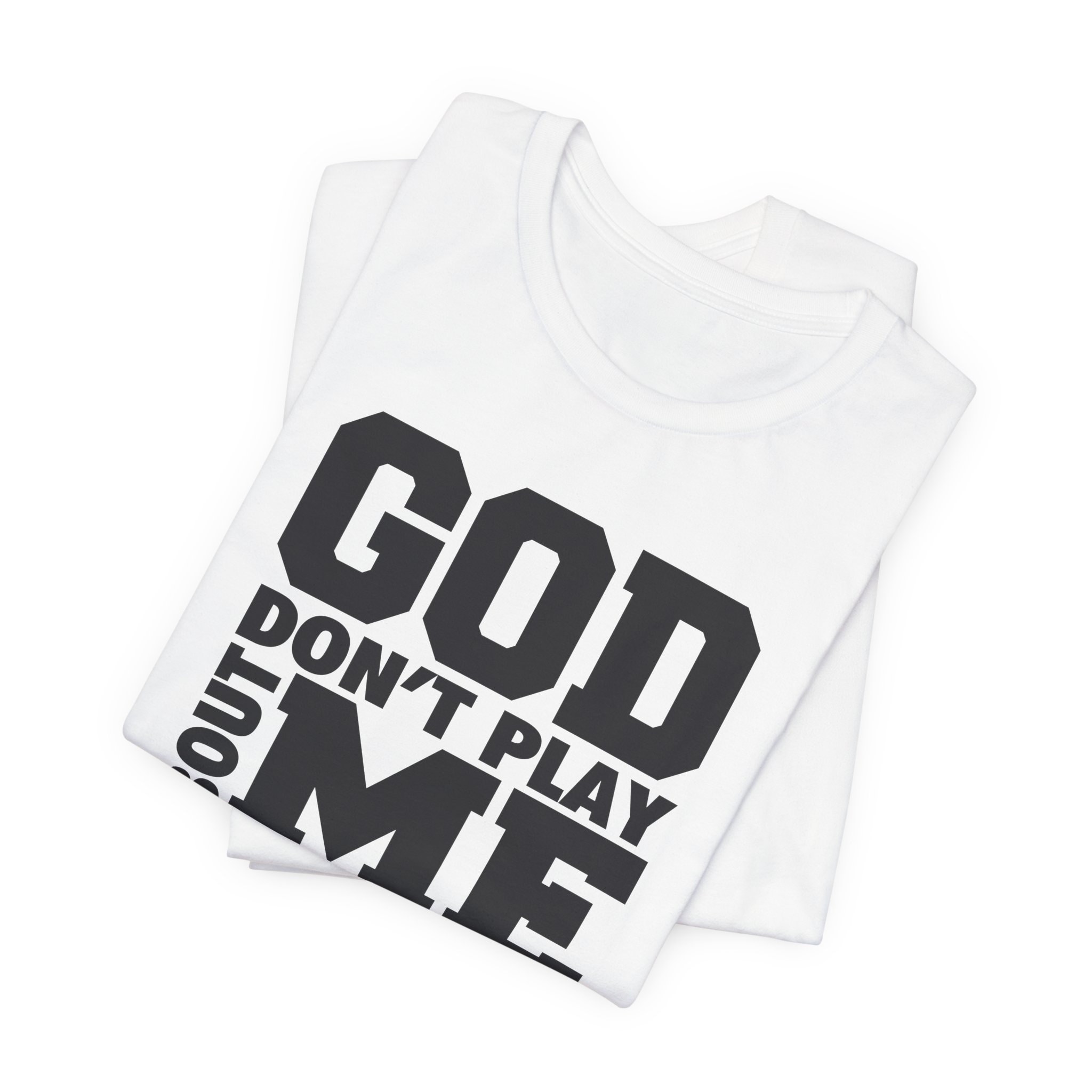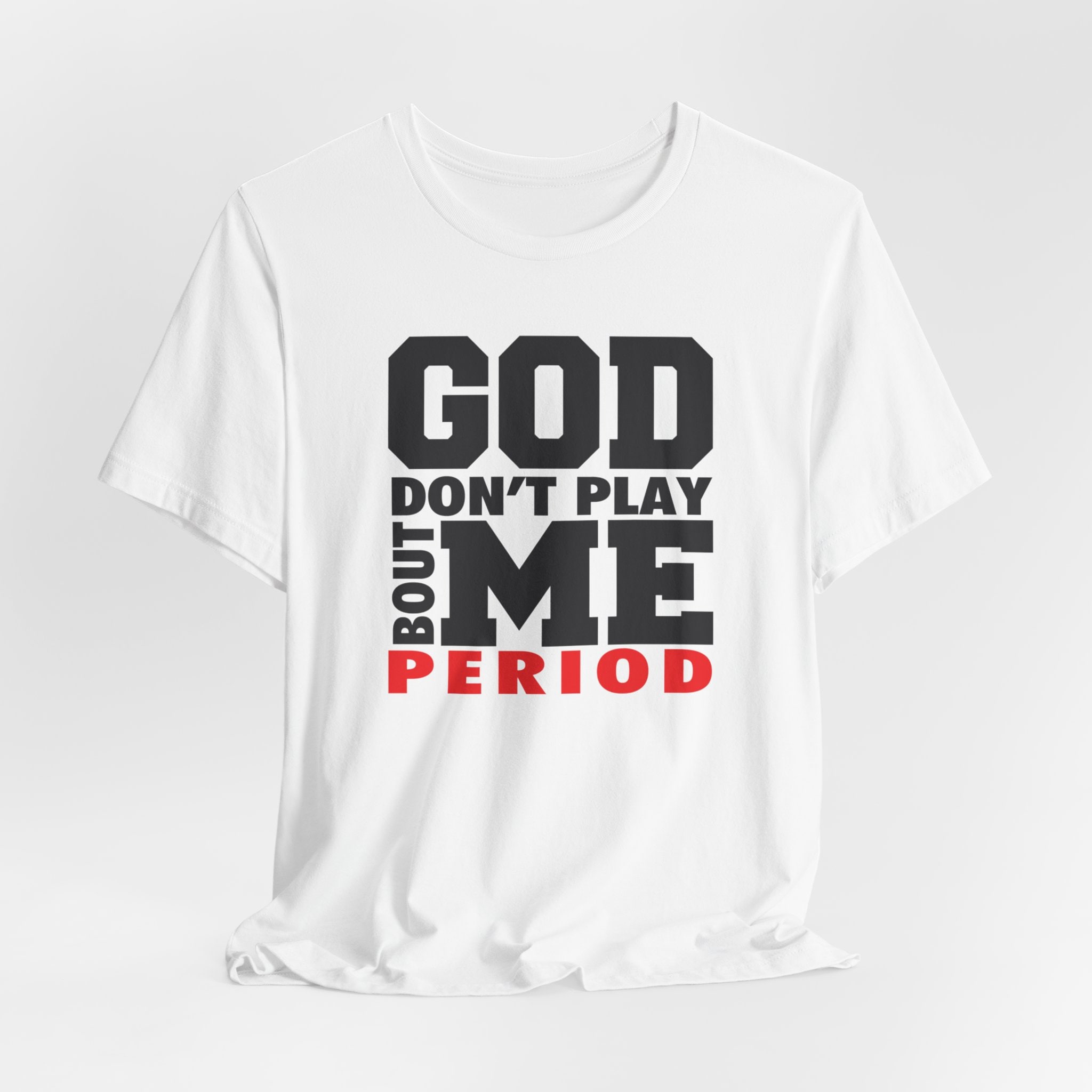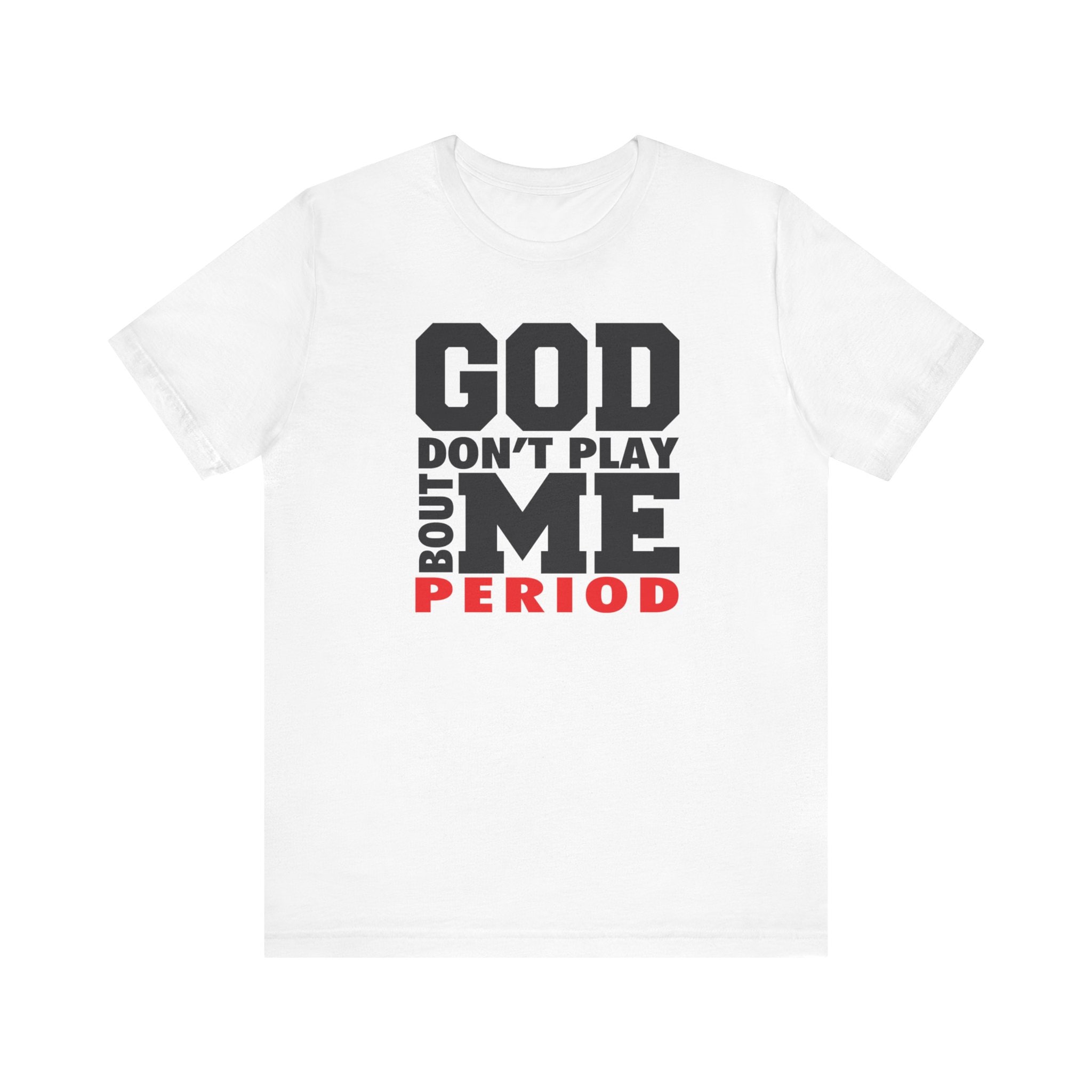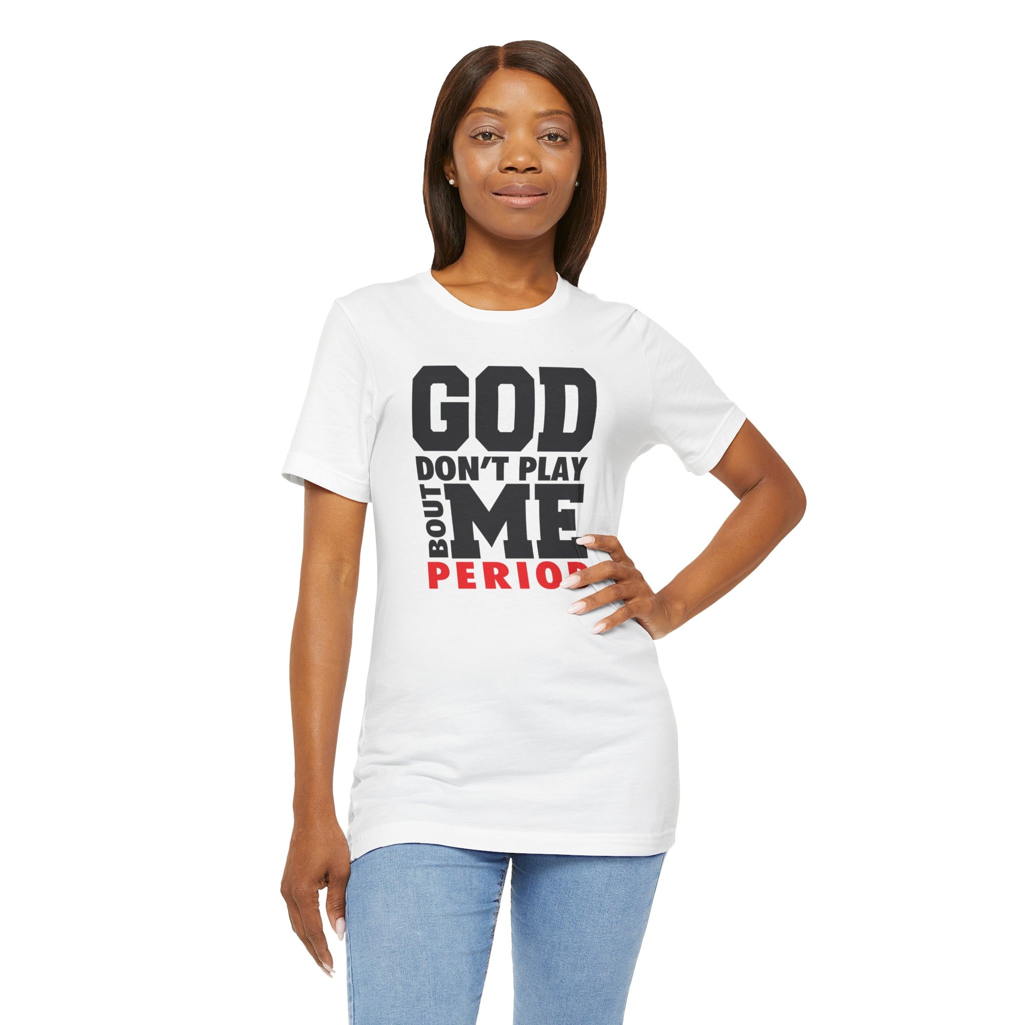 Introducing the "God Don't Play About Me T-shirt," a powerful expression of faith and inspiration. This classic unisex jersey short sleeve tee fits like a well-loved favorite. Soft cotton and quality print make users fall in love with it over and over again. These t-shirts have-ribbed knit collars to bolster shaping. The shoulders are tapered for a better fit over time. Dual side seams hold the garment's shape for longer. .: Made with 100% Airlume combed and ring-spun cotton, a lightweight fabric (4.2 oz/yd² (142 g/m²)) that is easy to layer, breathable. Perfect for active and leisure wear. .: The retail fit that is perfect for casual and semi-formal settings. The crew neckline adds a classic, neat style that's perfect for accessorizing. .: Bella+Canvas manufactures all its products in the US and internationally in humane, no-sweat-shop, sustainable way and is part of the Fair Labor Association as well as Platinum WRAP certified. .: The tear-away label minimizes skin irritations. .: Fabric blends: Ash and Heather Prism colors - 99% Airlume combed and ring-spun cotton, 1% polyester; Heather and Solid Blend colors - 52% cotton, 48% polyester; Athletic Heather and Black Heather - 90% cotton, 10% polyester.