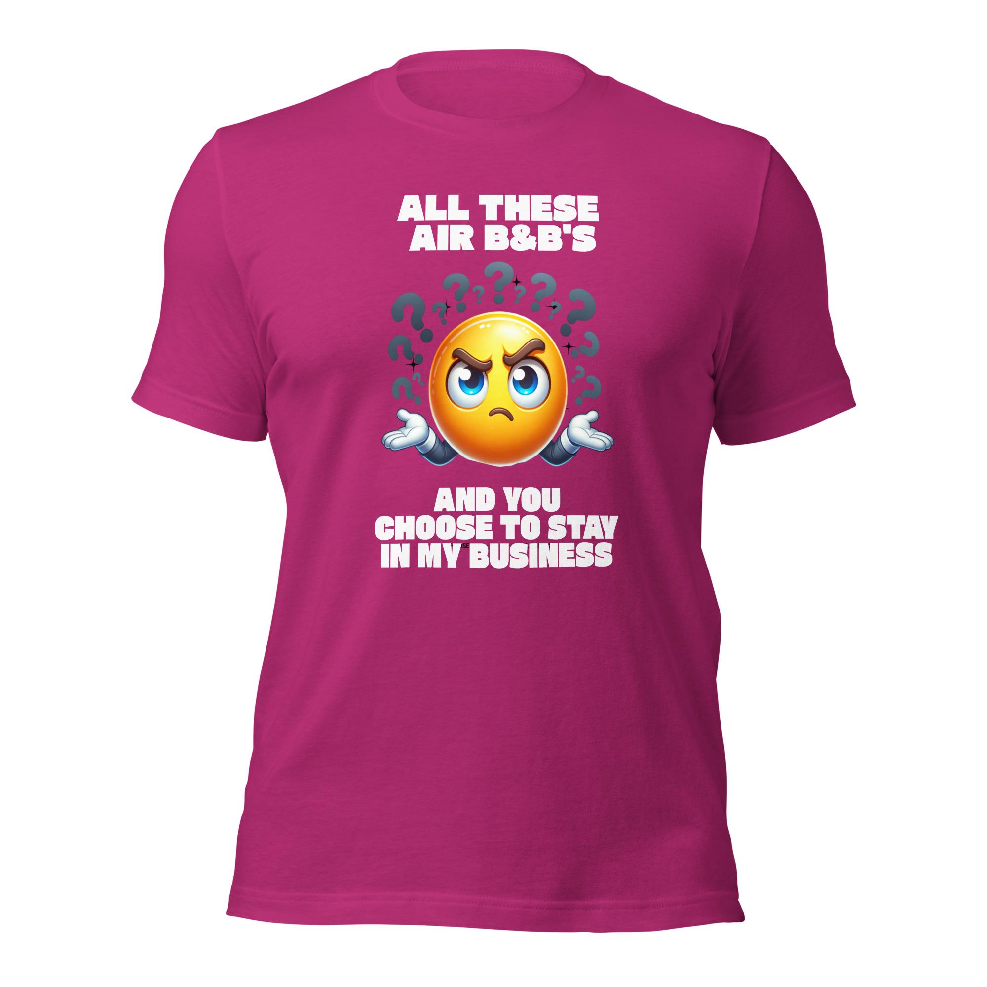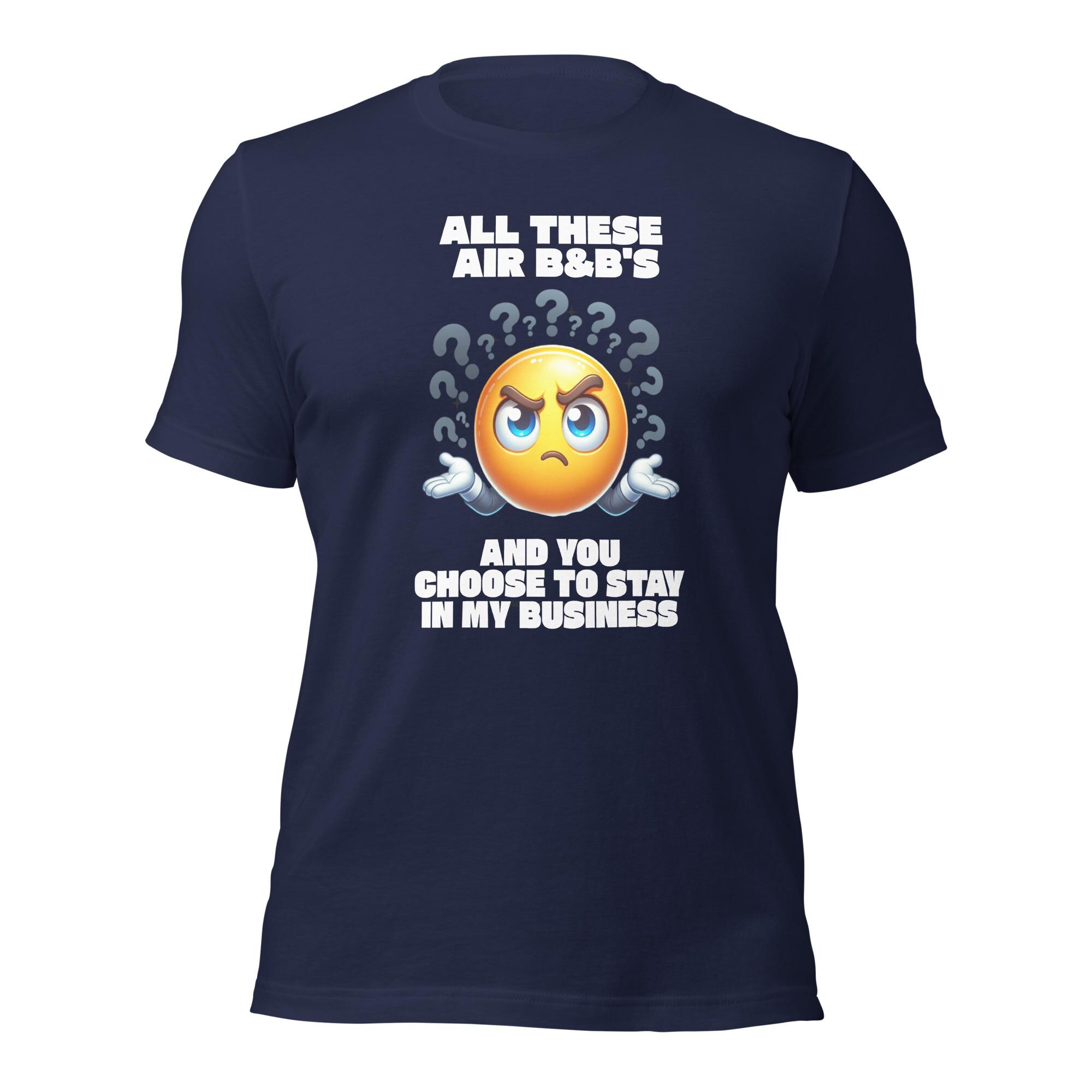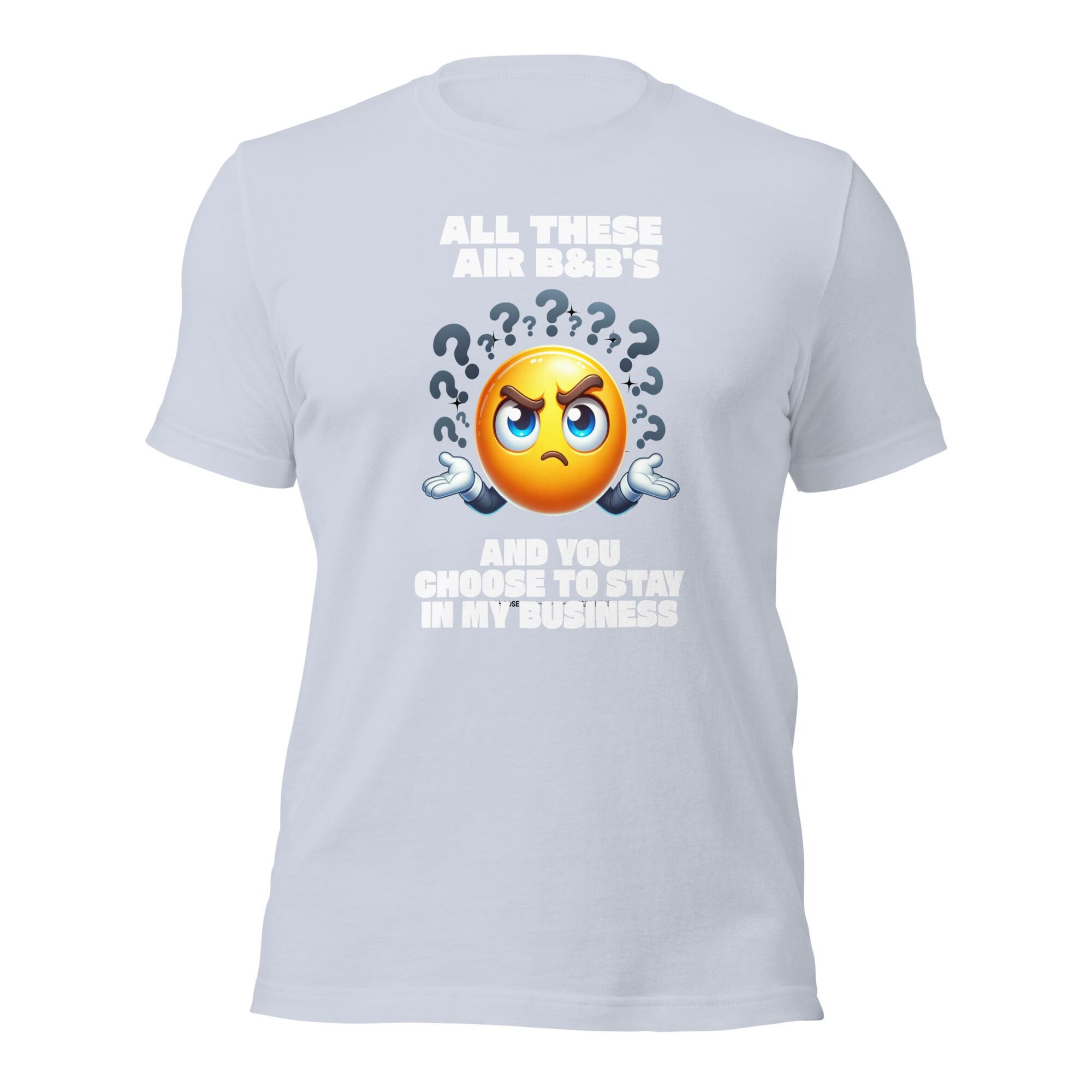 This t-shirt speaks volumes, with a subtle reminder that amidst all the places you can stay , you stay in my business. • 100% combed and ring-spun cotton (Heather colors contain polyester) • Fabric weight: 4.2 oz./yd.² (142 g/m²) • Pre-shrunk fabric • Side-seamed construction • Shoulder-to-shoulder taping • Blank product sourced from Nicaragua, Mexico, Honduras, or the US