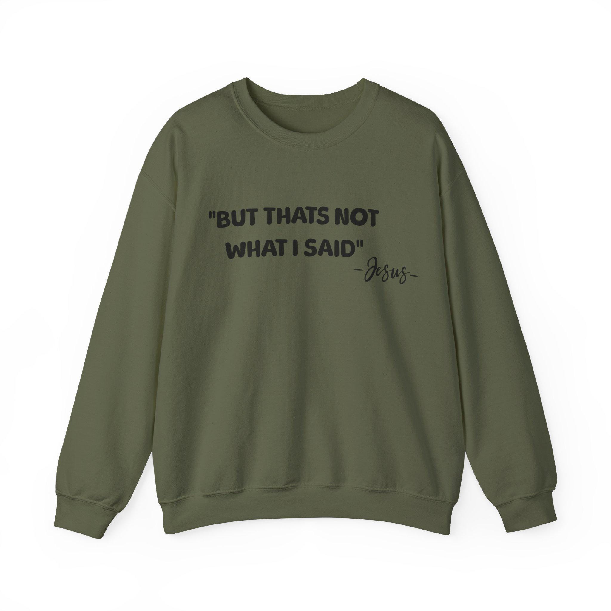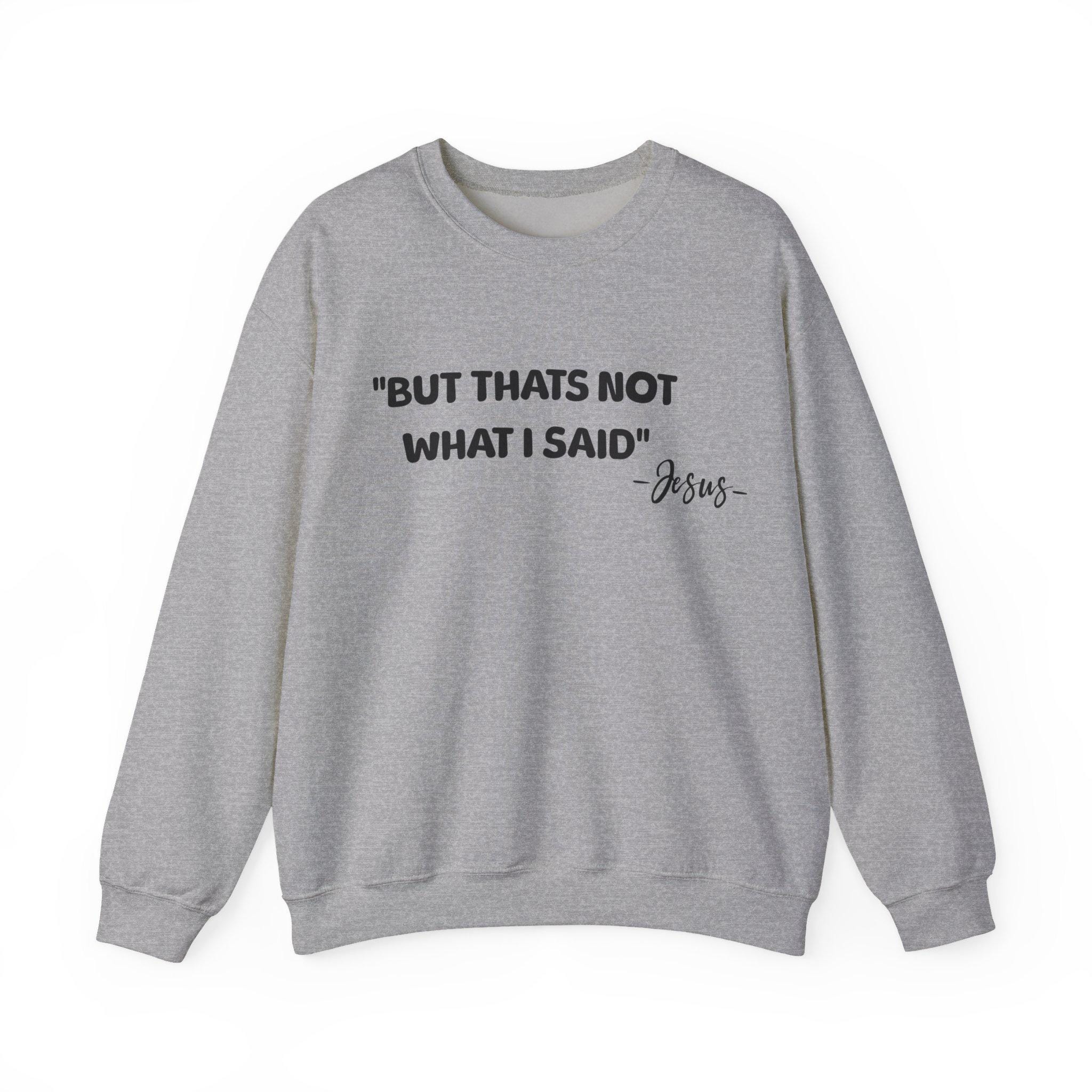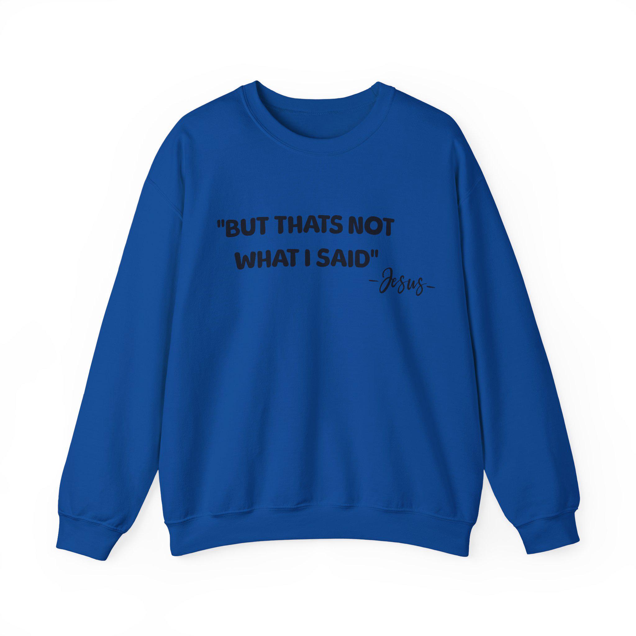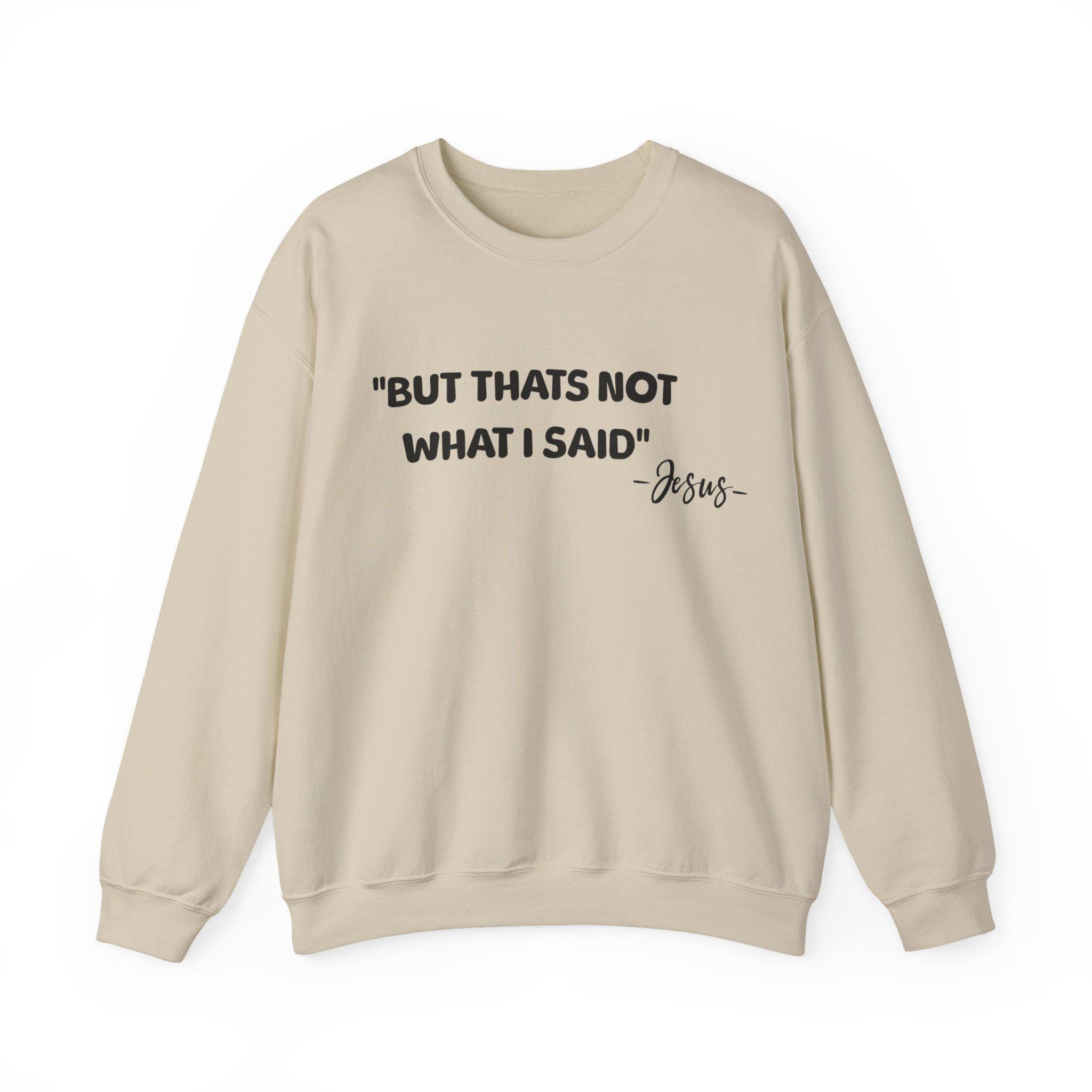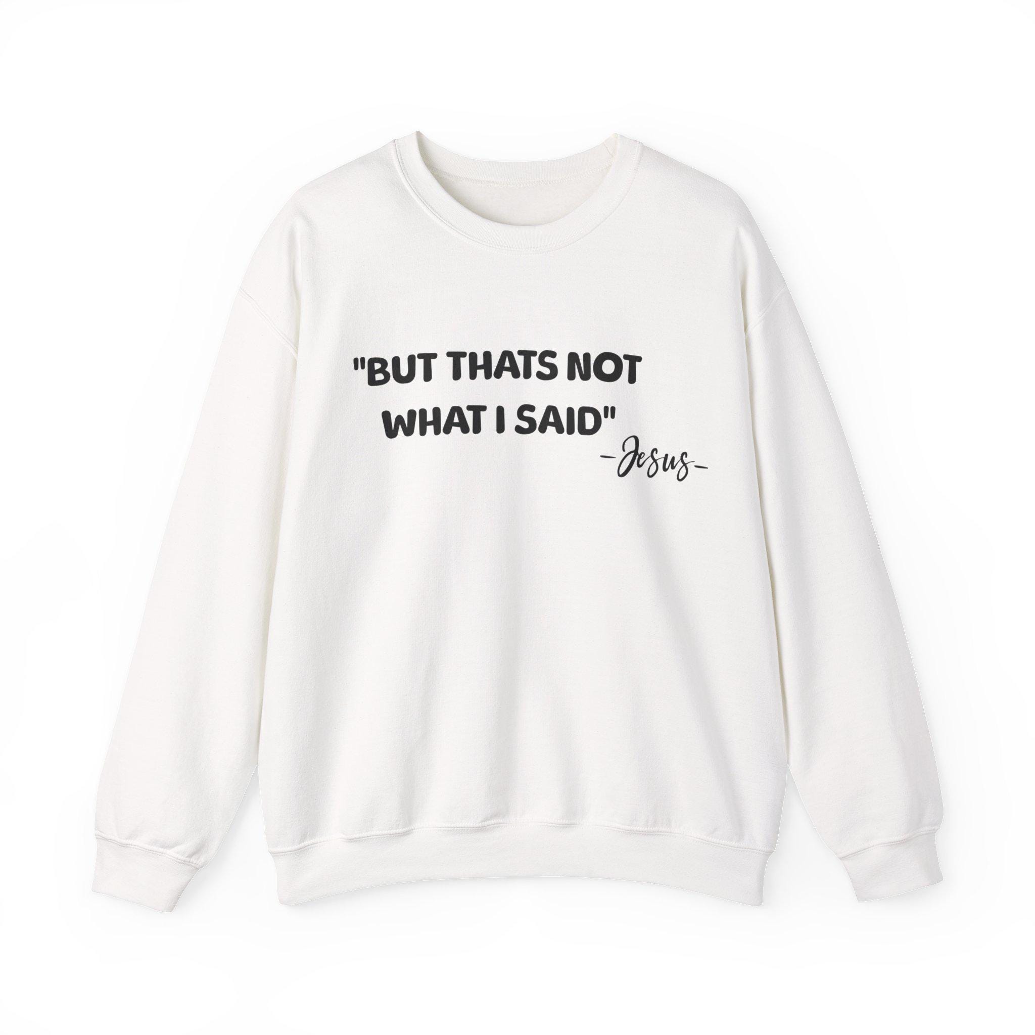 Introducing our cozy Unisex Heavy Blend™ Crewneck Sweatshirt, perfect for adding a touch of warmth and comfort to any outfit. With a clean-cut style and a classic fit, this sweatshirt makes lounging at home or heading out effortlessly chic. The soft, medium-heavy fabric blend ensures it's ideal for the colder months, making it a staple for your winter wardrobe. It’s not just a sweatshirt; it’s a conversation starter, featuring the fun print, "BUT THAT'S NOT WHAT I SAID - Jesus," bringing a light-hearted vibe to your casual wear. Great for those who appreciate humor in their style or wish to add a spiritual touch to their look, this sweatshirt is also an excellent gift for friends and family during holidays, birthdays, or any casual get-together. Celebrate cozy moments of joy and laughter, and make this sweatshirt a go-to piece for every occasion.