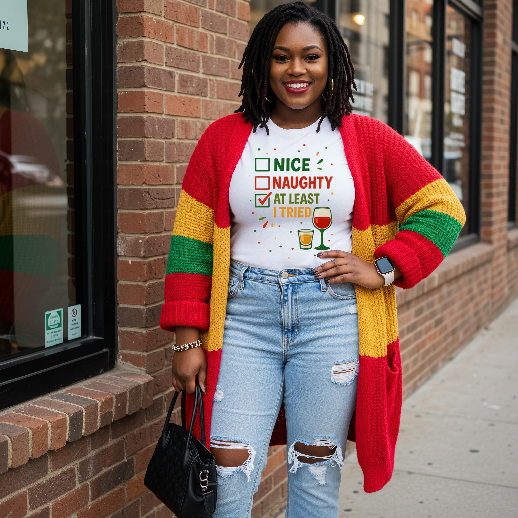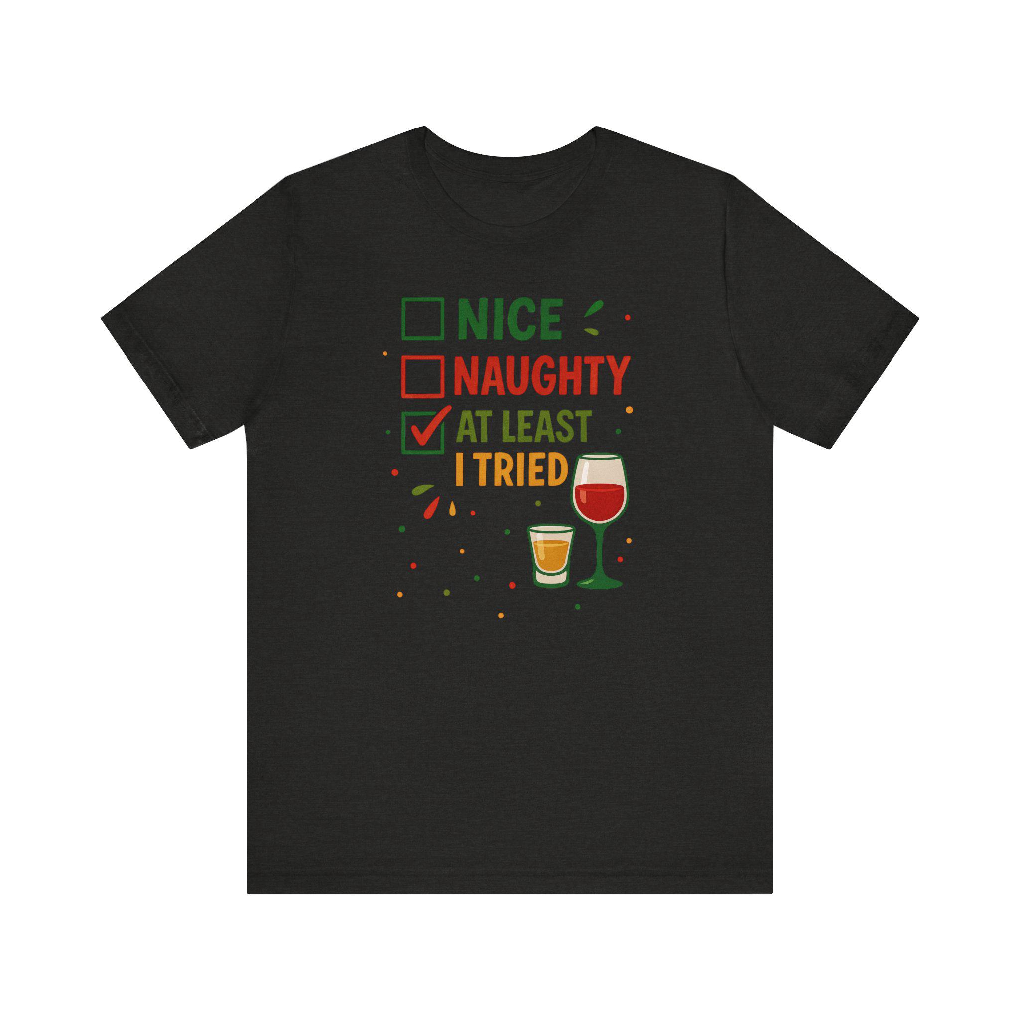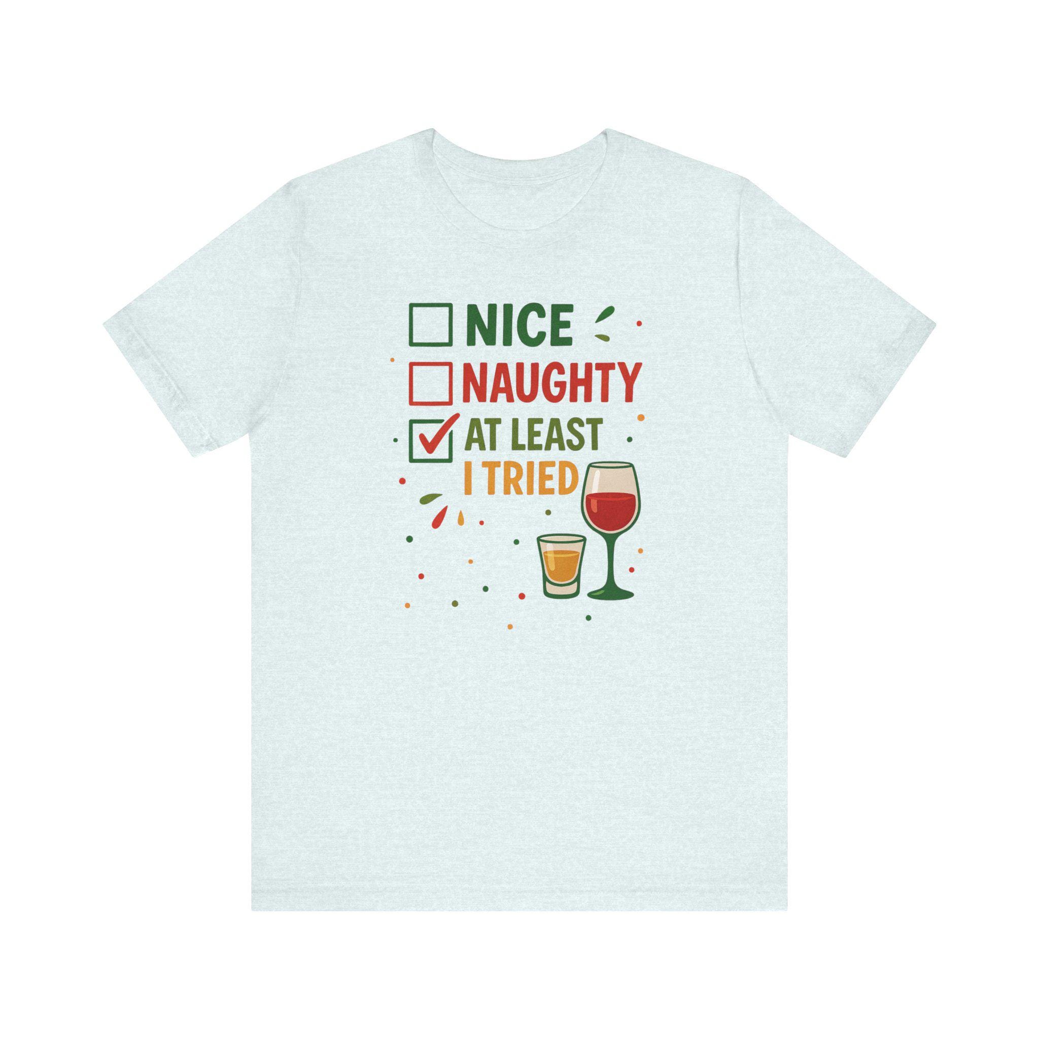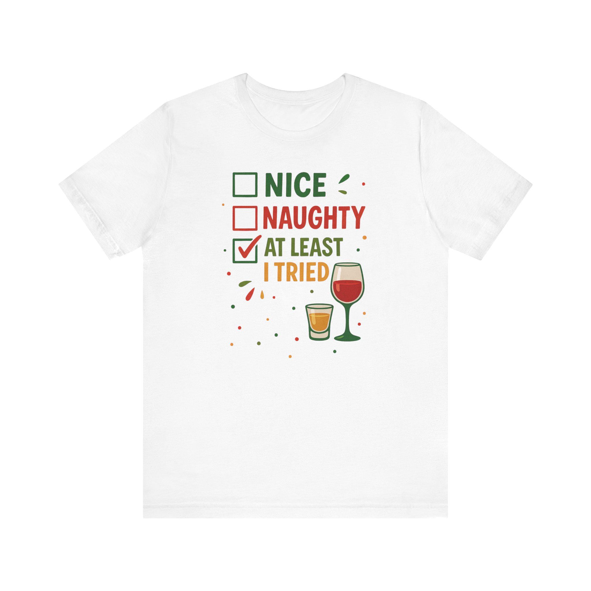 Lightweight and breathable, this jersey tee carries a playful holiday spirit—checkboxes reading “Nice,” “Naughty,” and a checked “At least I tried,” paired with a wine glass and shot illustration. It sits clean and flat against the chest, so the colorful DTF/DTG print stays crisp through washes. Wear it during festive nights with friends, cozy family gatherings, or casual days when you want a wink of humor. The retail crew neckline and tear-away label keep the fit neat and comfortable whether you layer it under a cardigan or wear it solo. Ethically made and REACH certified, the shirt blends everyday comfort with a cheeky seasonal vibe that slips easily into holiday rotations.