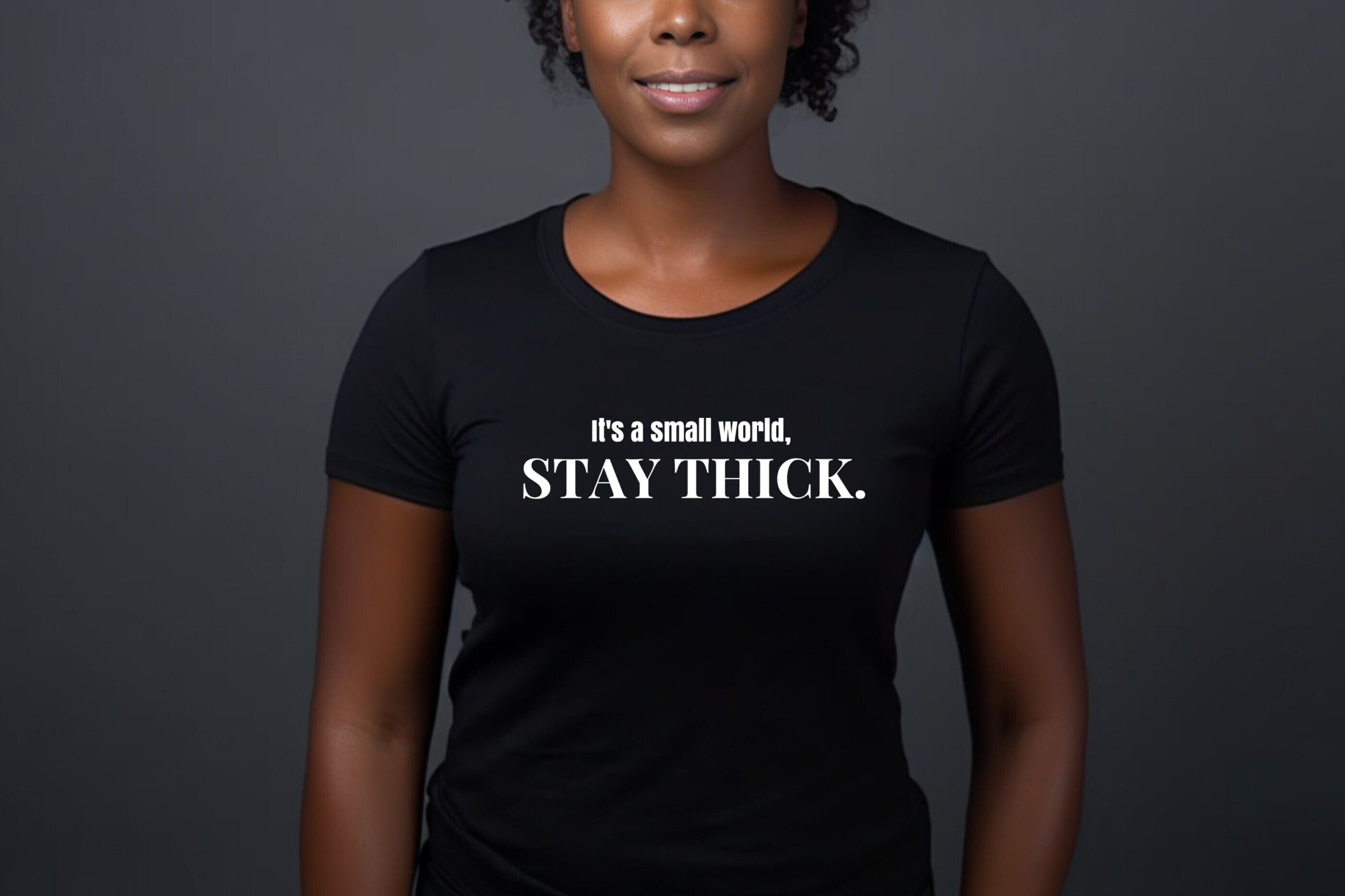 Introducing the "It's a small world, Stay thick tee shirt", a must-have for confident curvy girls. This tee is designed to celebrate and embrace body positivity, making it the perfect addition to any Curvy girls wardrobe. Whether you're running errands or lounging at home, Express your unique style and embrace body positivity.